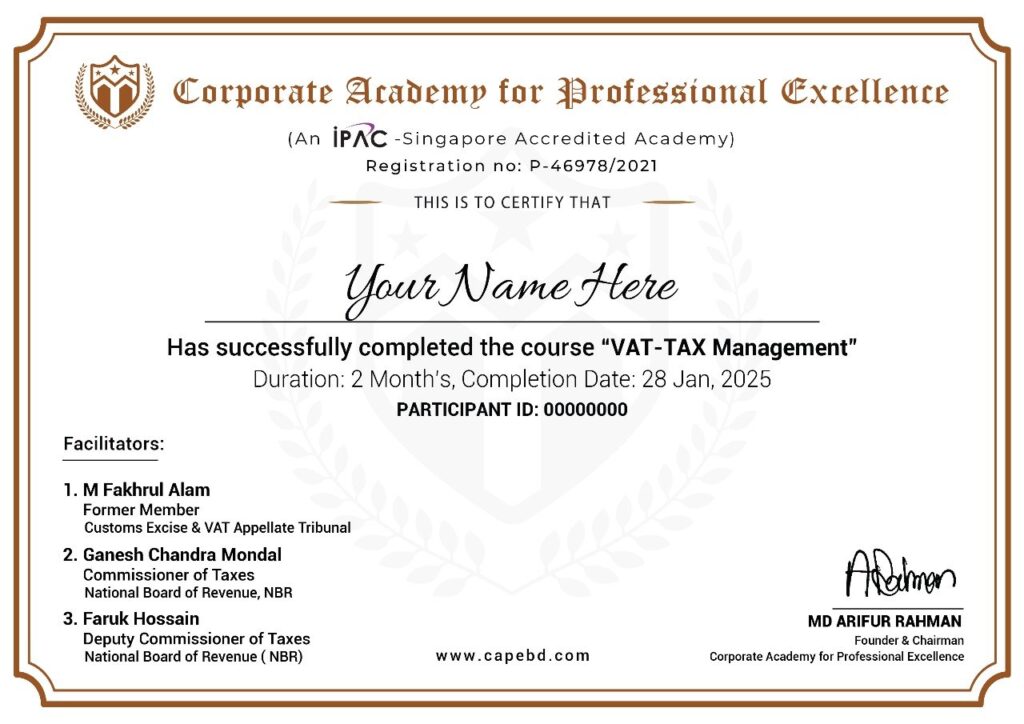 This 2-month, 12-session certifcate course is carefully designed to equip participants with the complete work ow of VAT & Tax management in Bangladesh, directly guided by senior o cials from the NBR.